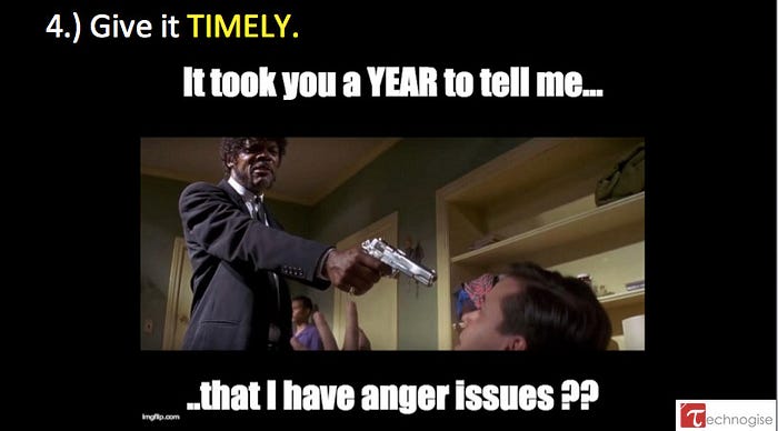 Feedback can be acted upon meaningfully, only if it is given on time. What’s the point of letting someone know that their skills need improvement, many months after you’ve realised so? Would we be happy if we are informed of our performance concerns a year late?